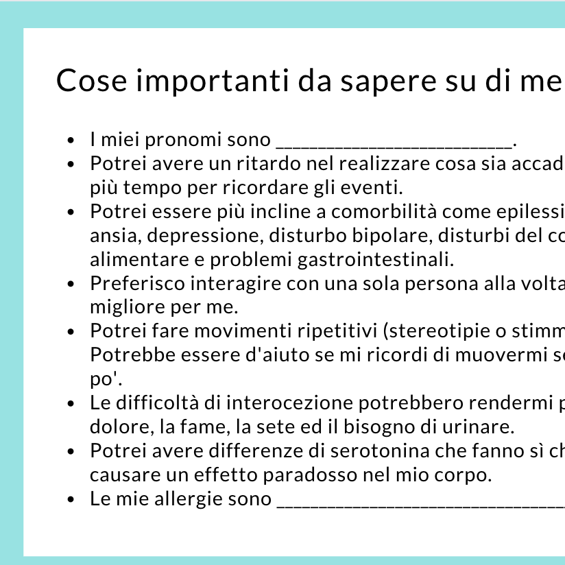 Questo è un PDF stampabile formato tessera, che puoi tenere con te anche in caso di emergenza. La carta è pensata per essere consegnata al personale sanitario e/o alle forze dell'ordine, per aiutare a spiegare le precauzioni che potrebbero esserti utili durante situazioni di stress, come persona nello spettro.